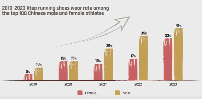 当然,马拉松依然是特步的核心业务。财报中表示,2023年中国内地的重点马拉松赛事中,特步跑鞋的穿着率于所有及破三跑者中高踞榜首,并位踞国际及国产品牌第一。在最近结束的2024年厦门马拉松赛中,特步延续其亮眼表现,穿着率保持领先地位,于所有及破三跑者中分别达到41.8%和43.8%。