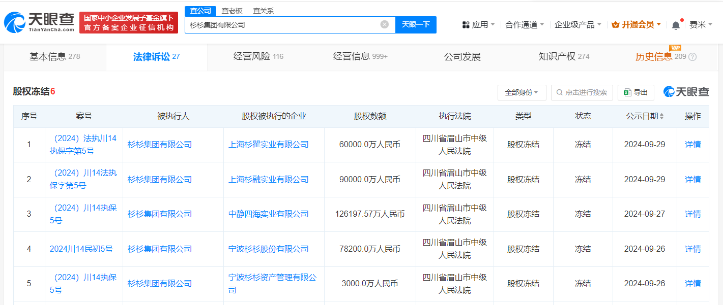 天眼查法律诉讼信息显示,近日,杉杉集团有限公司新增5条股权冻结信息,冻结股权数额总计35.7亿余元,股权被执行的企业分别为上海杉瞿实业有限公司、上海杉融实业有限公司、中静四海实业有限公司、杉杉股份(600884)、宁波杉杉资产管理有限公司,冻结期限均为3年,执行法院均为四川省眉山市中级人民法院。