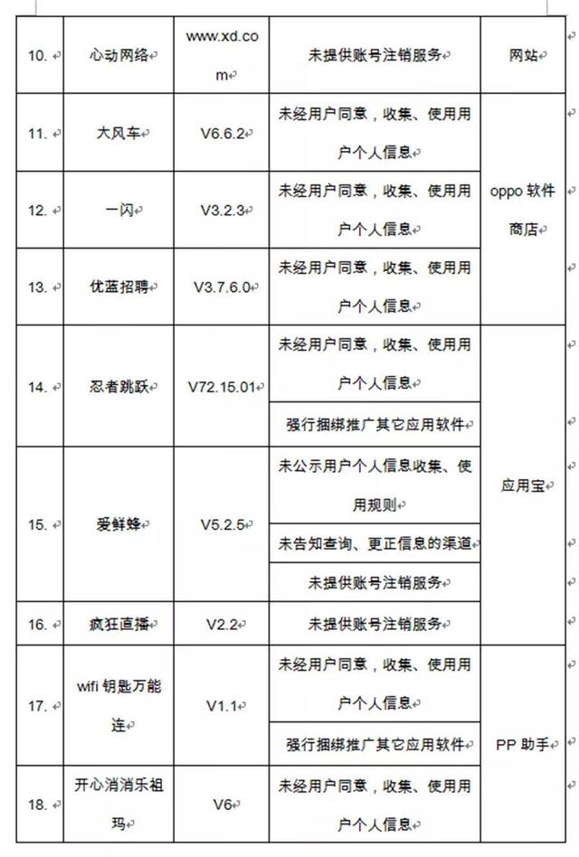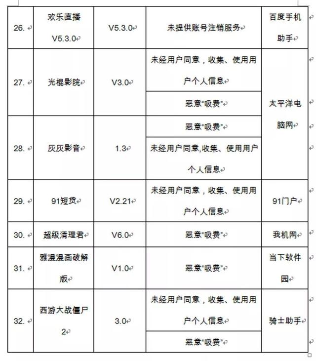 上述名单中,32个应用所涉及的问题包括“未经用户同意,收集、使用用户个人信息”、“未提供账号注销服务”、“未公示用户个人信息收集、使用规则”、“强行捆绑推广其他应用软件”、“未告知查询、更正信息的渠道”、“恶意‘吸费’”等。