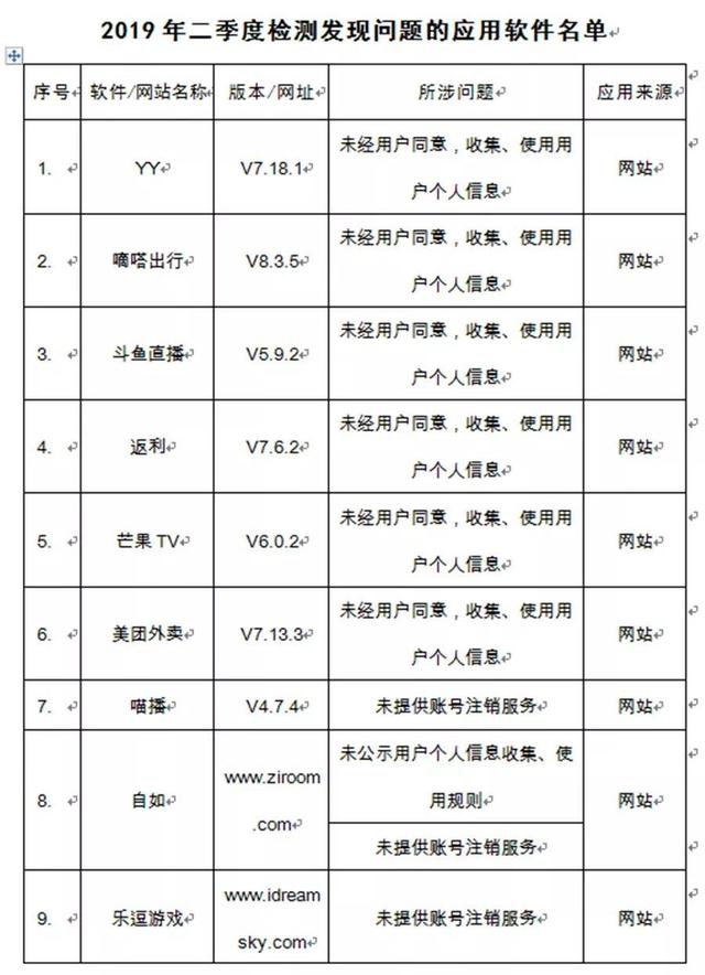 其中,“未经用户同意,收集、使用用户个人信息”问题所涉应用最多,涉32个问题应用中的21个,用户常用的应用,如YY、嘀嗒出行、斗鱼直播、返利、芒果TV、美团外卖等均存在这个问题。