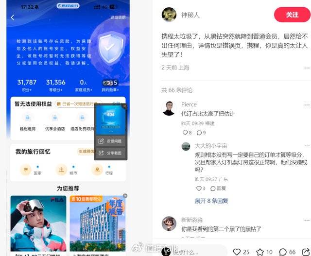 近日一名携程黑钻会员在网上称携程太让人失望了,他表示自己的黑钻突然就降到普通会员,居然给不出任何理由,详情也是错误页!