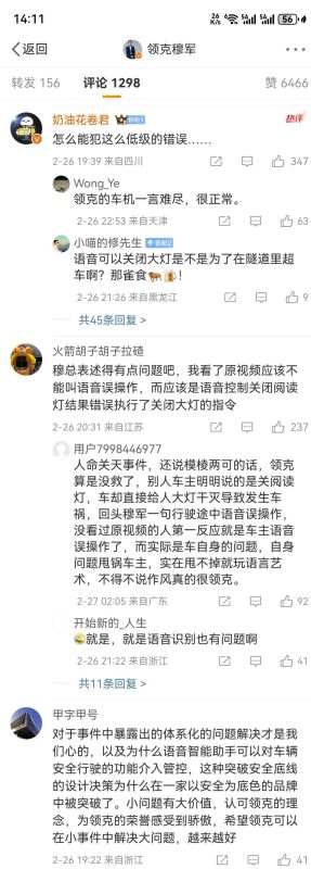 领克在一天之内完成了问题修复并且推送更新,展现了其在事关行车安全问题上的快速响应效率。不过,在穆军微博下方的评论区,也有声音对领克提出了批评,且表示,穆军的回应存在不严谨的地方,一网民质疑称,“我看了原视频应该不能叫语音误操作,而应该是语音控制关闭阅读灯结果错误执行了关闭大灯的指令。”