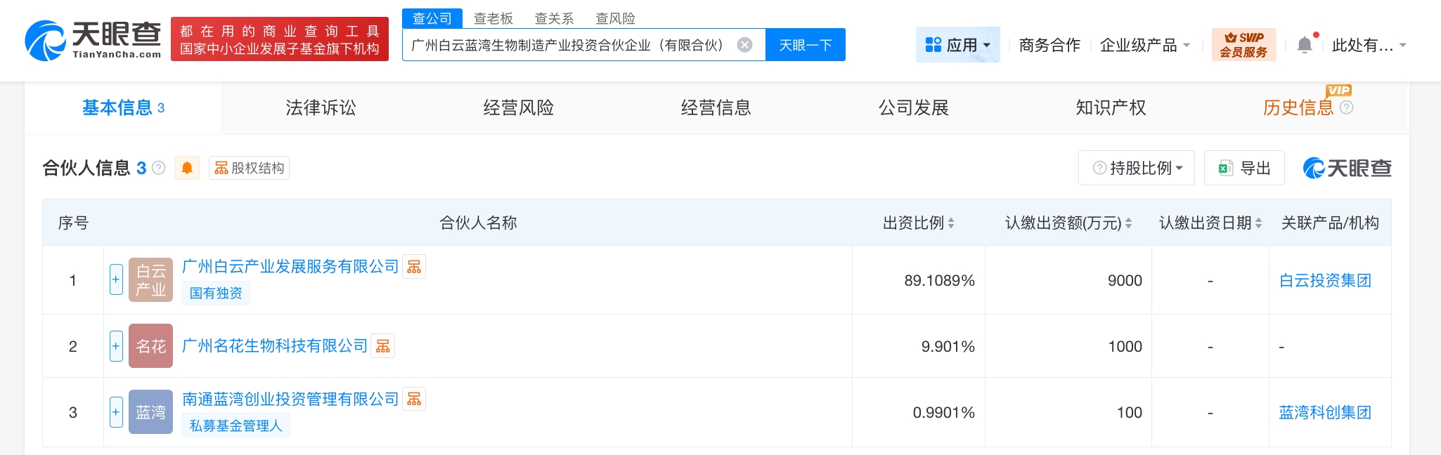 天眼查工商信息显示,近日,广州白云蓝湾生物制造产业投资合伙企业(有限合伙)成立,执行事务合伙人为南通蓝湾创业投资管理有限公司,出资额1.01亿人民币,经营范围为以私募基金从事股权投资、投资管理、资产管理等活动。合伙人信息显示,该合伙企业由广州白云产业发展服务有限公司、广州名花生物科技有限公司、南通蓝湾创业投资管理有限公司共同出资。