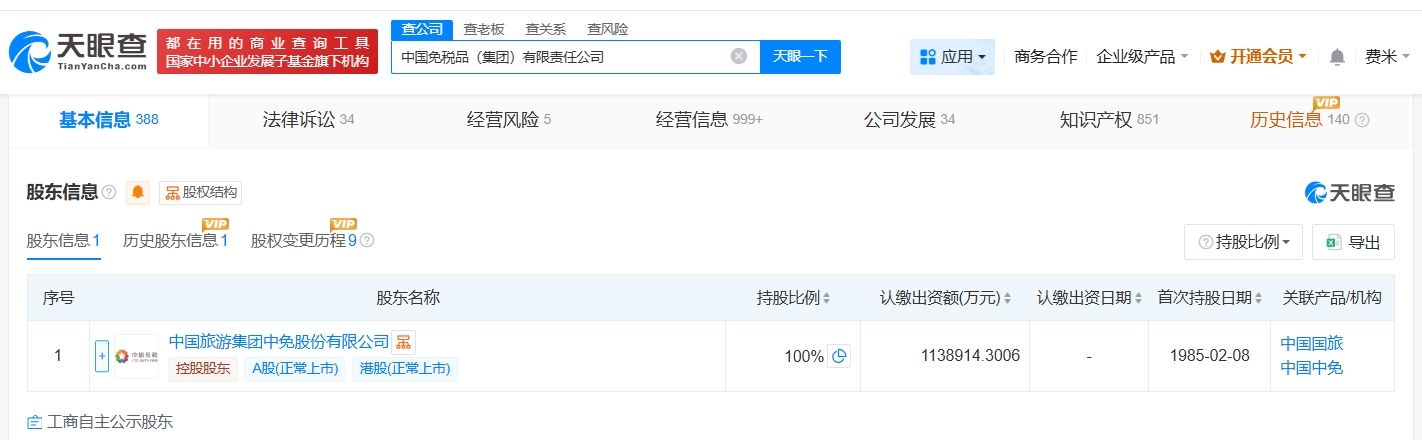 中国免税品(集团)有限责任公司成立于1985年2月,法定代表人为常筑军,经营范围包括销售免税汽车、预包装食品销售、特殊食品销售等。股东信息显示,该公司由中国中免(601888)全资持股。