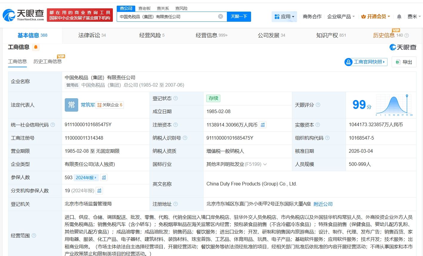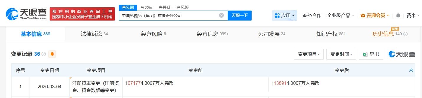 天眼查App显示,近日,中国免税品(集团)有限责任公司发生工商变更,注册资本由约107.2亿人民币增至约113.9亿人民币。