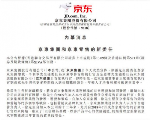 在公告中,京东给予徐雷很高的评价,称其自加入京东十余年尤其是2018年7月担任京东零售CEO以来,确立了“以信赖为基础、以客户为中心的价值创造”的京东零售经营理念,连续三年带领零售业务实现高质量增长。目前,京东集团具备完善的管理梯队,形成了以徐雷为代表的一大批价值观正、管理能力强、业务素质好的优秀管理者。