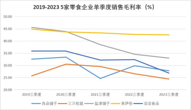 原本以高端路线自居的良品铺子,应该能通过提高客单价,享有比普通集合店更高的盈利水平。但实际情况恰恰相反。2019-2023年间,良品铺子主营业务毛利率从32.51%持续下滑到27.74%,参考同行盐津铺子32.94%、来伊份42.48%左右,良品铺子处于行业中下游水平。