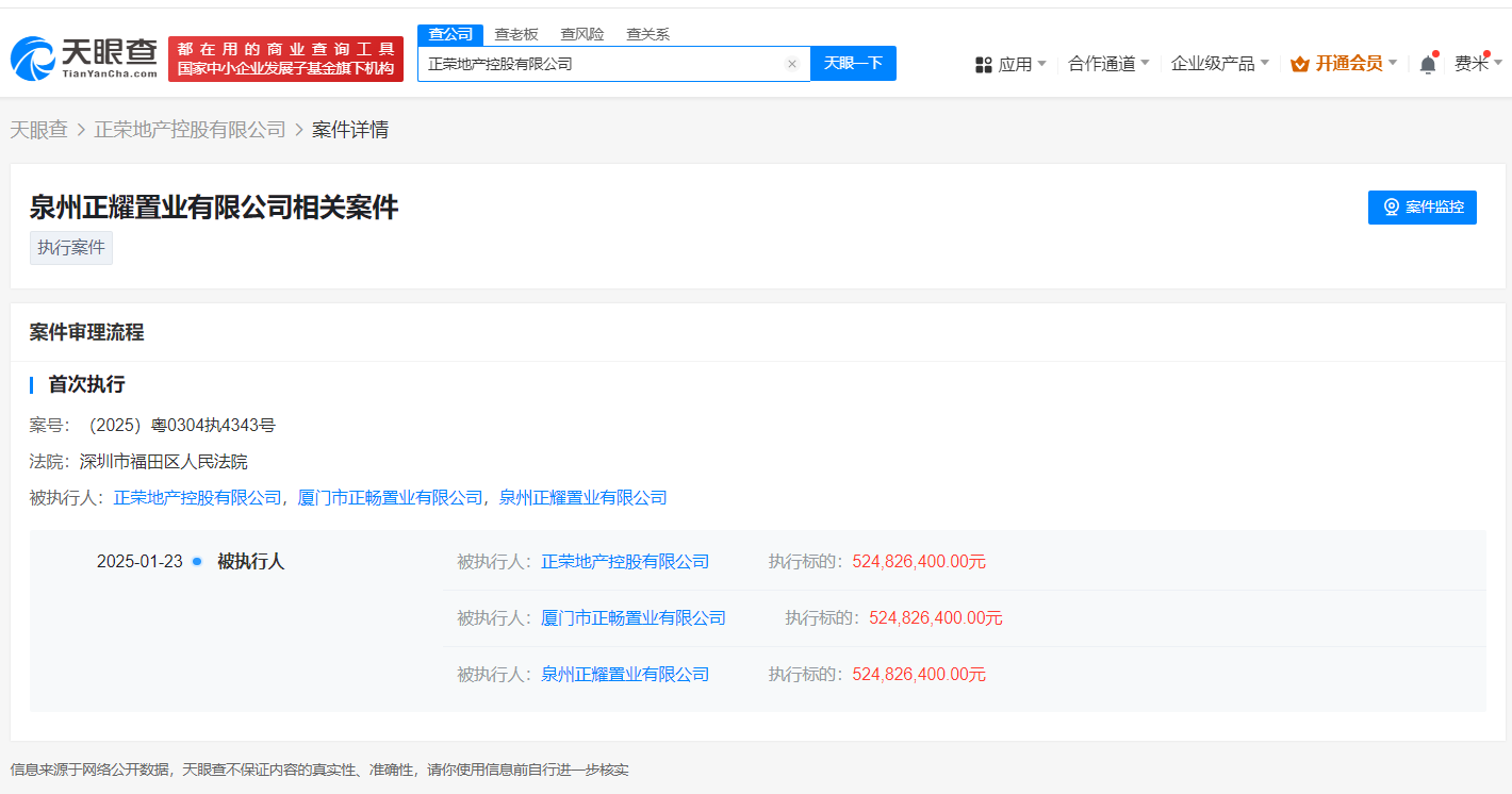 天眼查法律诉讼信息显示,1月23日,正荣地产控股有限公司、厦门市正畅置业有限公司、泉州正耀置业有限公司新增一则被执行人信息,执行标的5.2亿余元,执行法院为深圳市福田区人民法院。