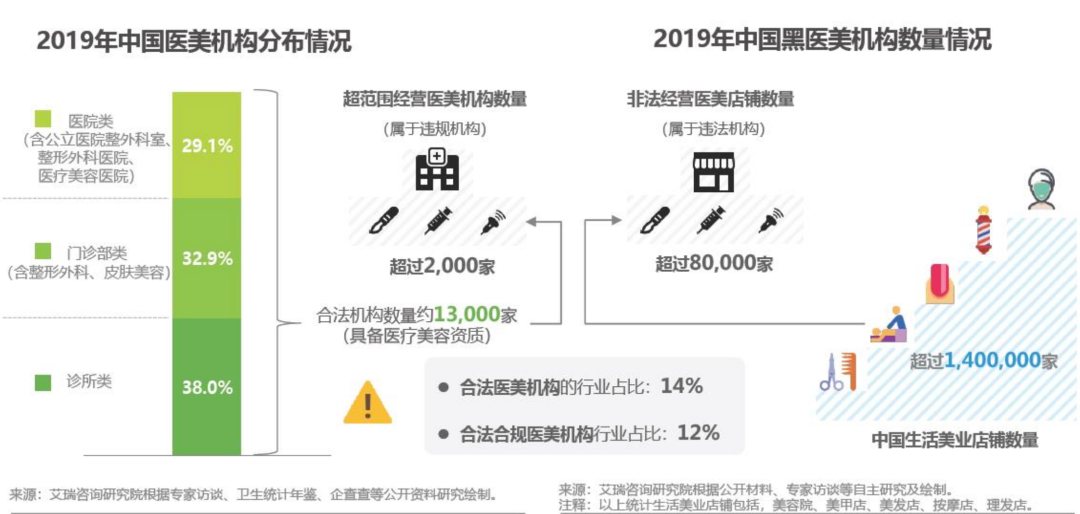 这也意味着,近九成的医美机构都是非法机构。不仅如此,艾瑞专家调研显示,市面上流通的针剂正品率只有33.3%,也就是1支正品针剂背后伴随着至少2支非法针剂的流通。