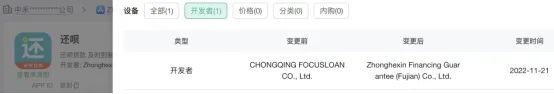 记者关注到,目前“还呗”APP的开发者信息已从分众小贷变更为中禾信融资担保(福建)有限公司。第三方平台七麦数据显示变更时间为2022年11月。