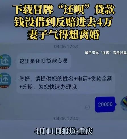 今年4月,重庆广播电视台发布《下载冒牌还呗贷款,钱没借到反赔进去4万》相关报道,披露“李鬼还呗App”相关典型案例:用户周先生通过一个网络链接下载安装了“还呗App”,打算贷款2万元应急,却被客服以“收款账号有误致贷款被冻结”为由,诱骗周先生向指定账户先后转账4万元,后对方要求其继续转账,此时周先生才意识到被诈骗。