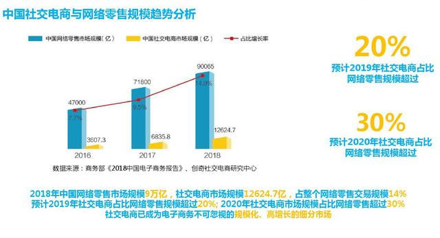 据《中国社交电商行业发展报告》显示,2019年社交电商市场规模预计达到20605.8亿元,同比增长高达63.2%,以去年10万亿网络零售总额来计算,社交电商整体规模已占到整体电商的20%,该报告预测2020年这一占比或将达到30%,按照这个趋势,用不了几年,社交电商与传统电商就能分庭抗礼。