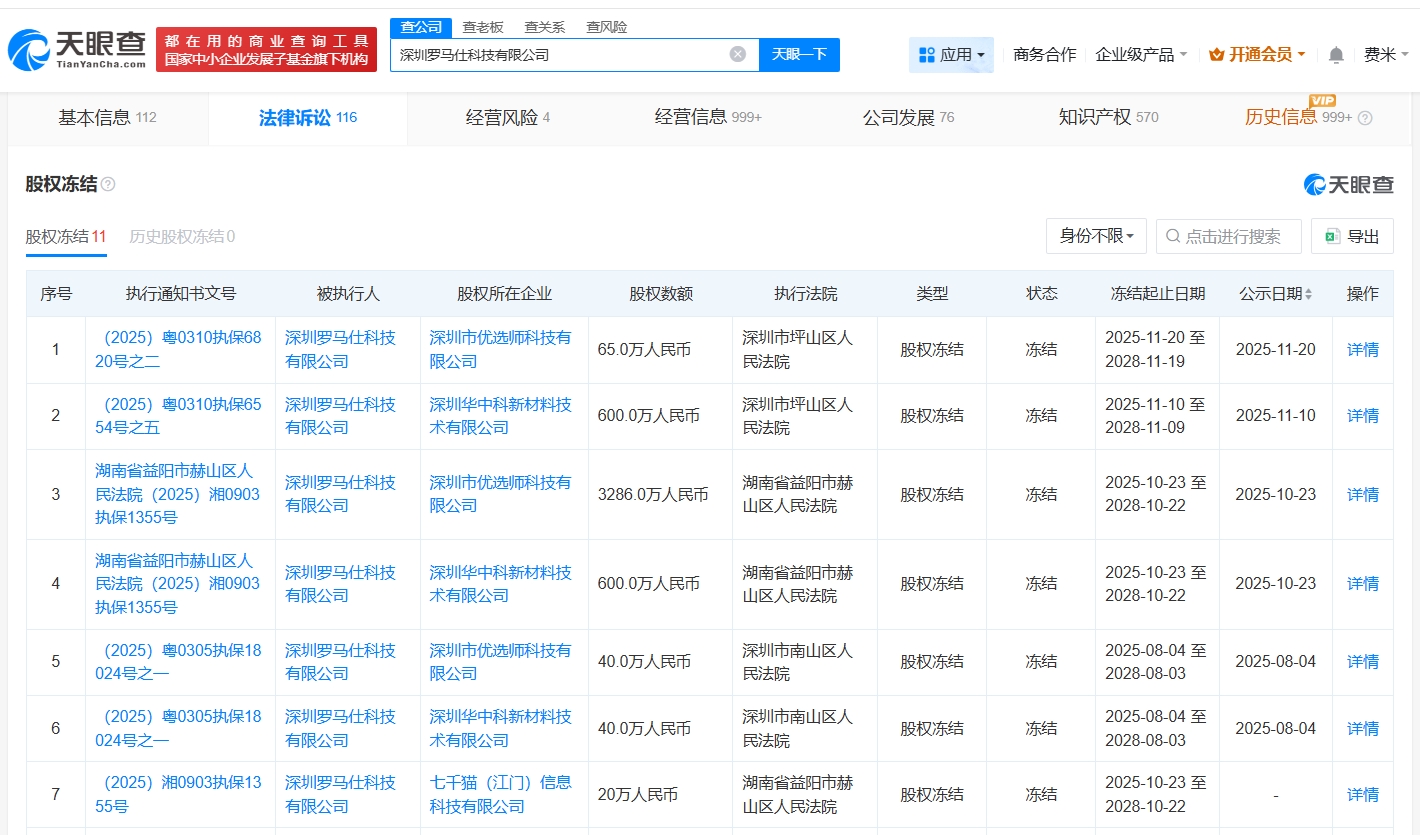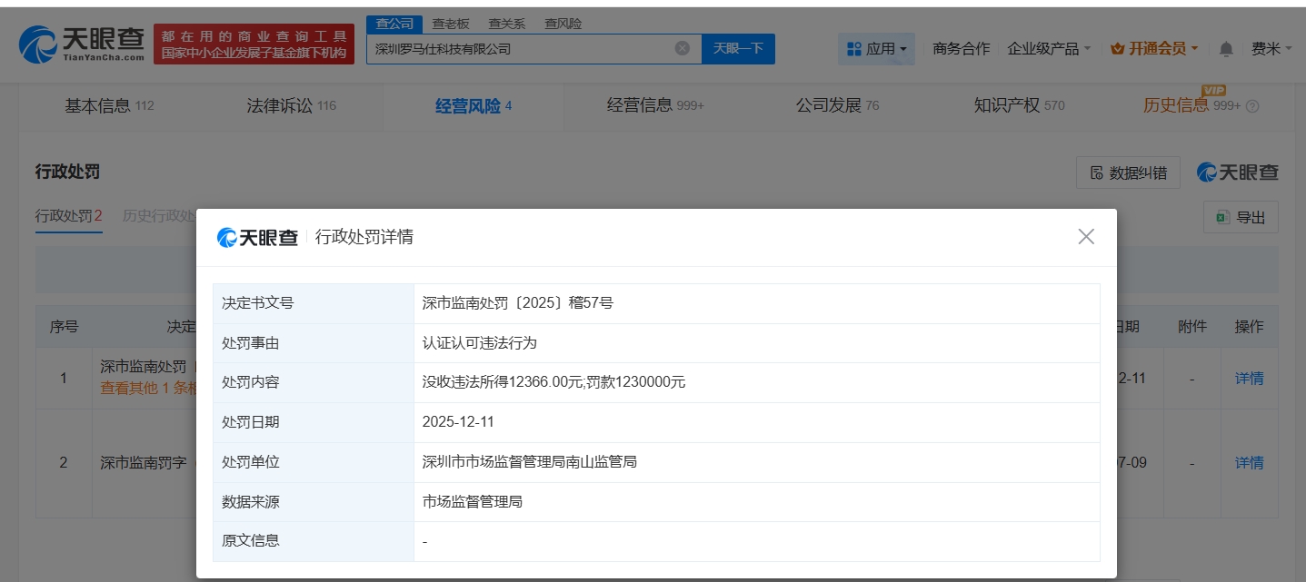 天眼查工商信息显示,深圳罗马仕科技有限公司成立于2012年3月,法定代表人为雷社杏,注册资本600万人民币,经营范围包括国内贸易、经营进出口业务、服装的设计及销售等。股东信息显示,该公司由雷桂斌、雷灿伙共同持股。天眼风险信息显示,去年12月,该公司曾因违反强制认证规定、虚假宣传,被深圳市市场监督管理局南山监管局没收违法所得1.2万余元、罚款123万元。此外,该公司旗下多家公司股权被冻结,包括深圳市优选师科技有限公司、深圳华中科新材料技术有限公司等。