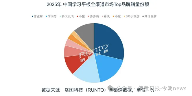 当前学习机行业早已告别野蛮生长,进入头部绞杀、四面承压的新阶段,市场集中度越来越高,洛图科技2025年全渠道数据显示,前八大品牌的市场份额合计超过88.4%,曾经的步步高、读书郎、优学派头部“老三家”已经被作业帮、学而思、科大讯飞、小猿组成的“新四强”取代。