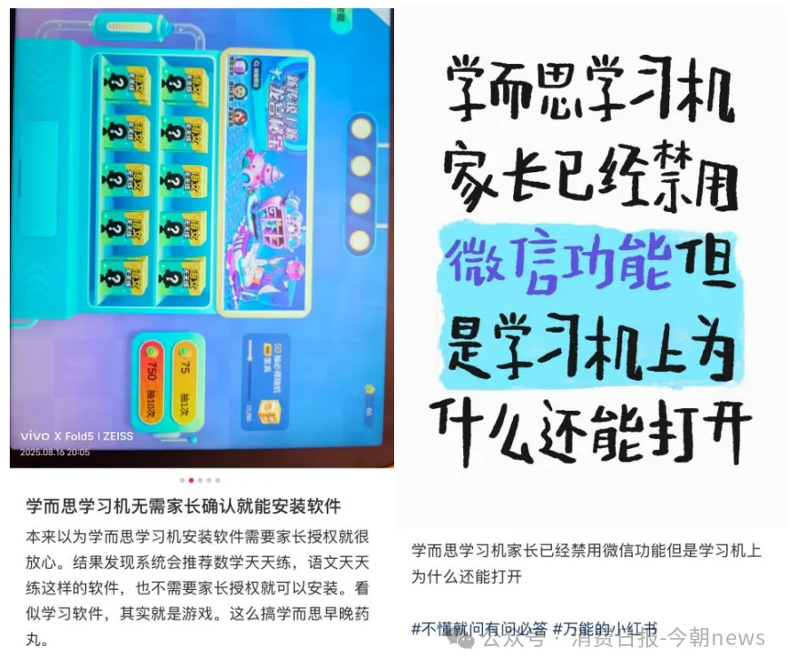 比内容安全问题更让家长无法接受的是,家长管控功能形同虚设,有家长明确表示,本来以为学而思学习机安装软件需要家长授权就很放心,结果发现系统会推荐数学天天练、语文天天练这样的软件,也不需要家长授权就可以安装,“看似学习软件,其实就是游戏”。还有家长已经禁用微信功能,但学习机上依然能够打开。