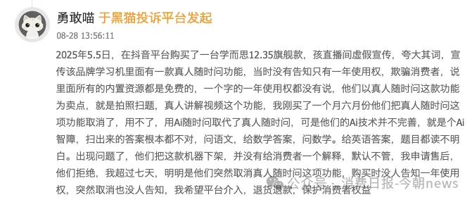 一位消费者在黑猫投诉平台表示,2025年5月5日,在抖音平台购买了一台学而思学习机旗舰款,宣传该品牌学习机里面有一款真人随时问功能,当时没有告知只有一年使用权,说里面所有的内置资源都是免费的。