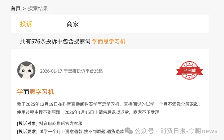 然而,在销量与业绩一路走高的背后,学而思学习机却深陷多重争议漩涡,从内容安全漏洞、家长管控失效,到功能宣传缩水、品控问题频发,再到售后推诿拖延,层出不穷的用户投诉持续消耗其品牌信任。