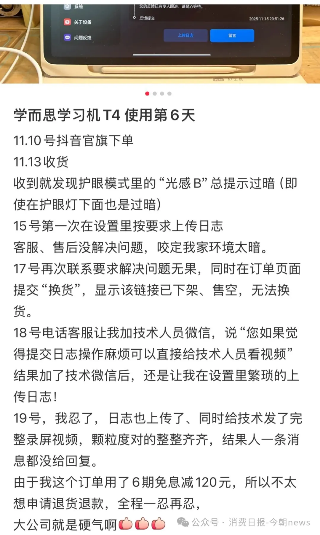 更让用户寒心的是学而思糟糕的售后与履约服务,这位遇到护眼功能故障的用户,15号第一次在设置里按要求上传日志,客服、售后始终没解决问题,还咬定是家里环境太暗,17号再次联系要求解决问题无果,同时在订单页面提交“换货”,却显示该链接已下架、售空,无法换货。