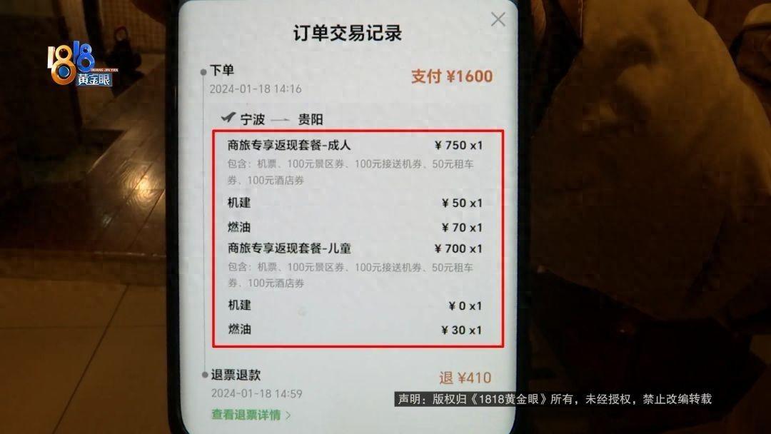 他说,1月18号下午两点多,妻子购买了两张1月20号从宁波飞往贵阳的机票,打算带孩子回趟娘家,总共付了1600元,包含两个“商旅专享返现套餐”,以及机建、燃油的费用。