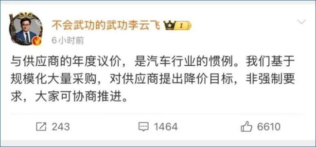 11月27日,比亚迪品牌及公关处总经理李云飞发文回应网传 “比亚迪要求供应商降价10%”,并表示此为行业惯例,并非强制要求。