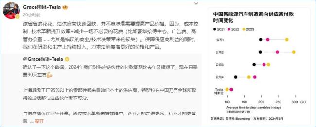 11月28日,特斯拉全球副总裁陶琳发博文表示“给供应商快速回款,并不意味着需要提高产品价格”,并表示在2024年特斯拉对供应商付款周期相比去年有所缩短。