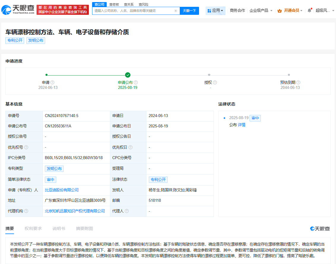 天眼查App显示,8月19日,比亚迪股份有限公司申请的“车辆漂移控制方法、车辆、电子设备和存储介质”专利公布。