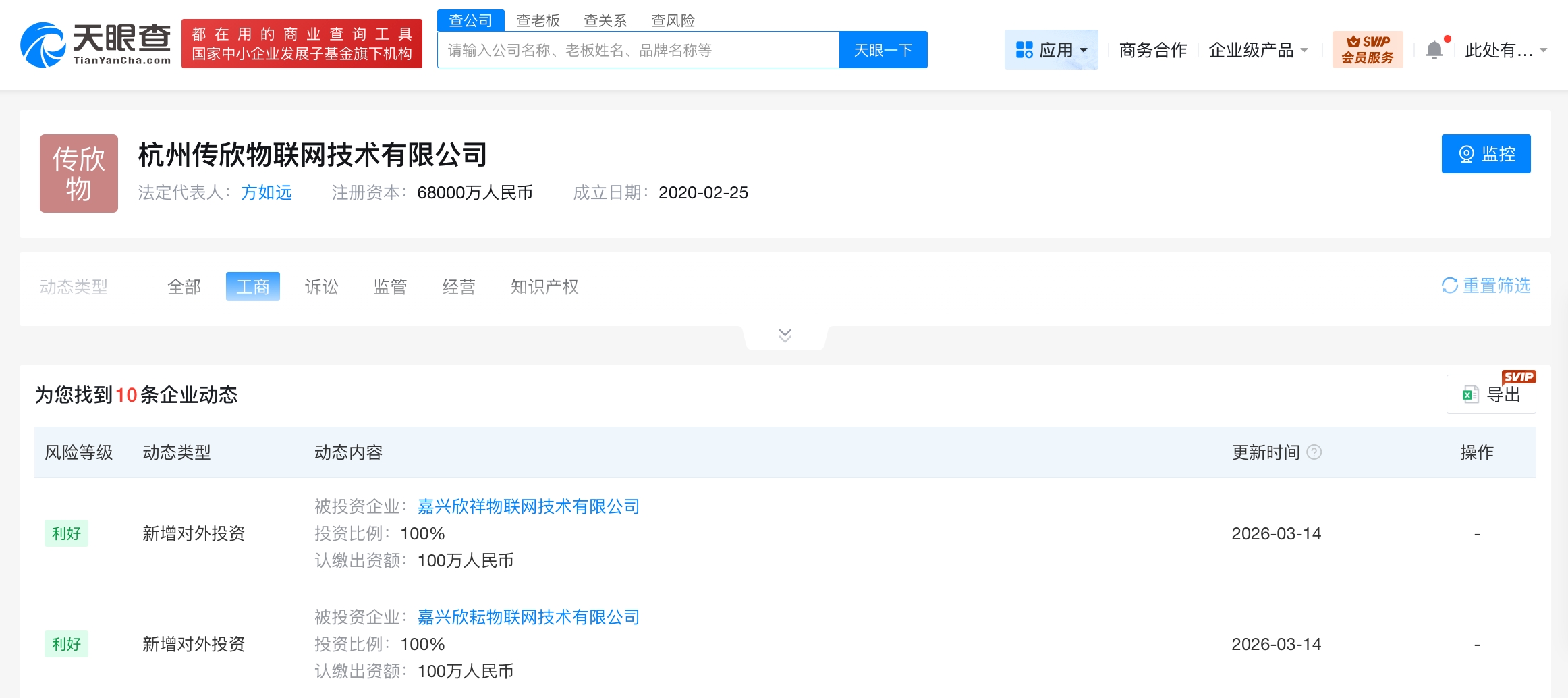 天眼查工商信息显示,近日,嘉兴欣祥物联网技术有限公司、嘉兴欣耘物联网技术有限公司成立,法定代表人均为方如远,注册资本均为100万人民币,经营范围包括物联网技术研发、物联网技术服务、信息技术咨询服务、物联网设备销售、普通货物仓储服务、智能仓储装备销售等。股东信息显示,上述2家公司均由菜鸟网络旗下杭州传欣物联网技术有限公司全资持股。