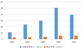 2019年一季度,拼多多营收的增长主要来源于在线营销技术服务收入的强劲增长。数据显示,第一季度,拼多多在线营销技术服务收入达39.484亿元,较去年同期的11.081亿元同比增长256%。佣金收入为5.968亿元,较去年同期的人民币2.765亿元同比增长116%。