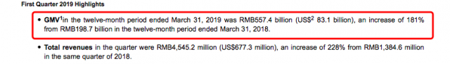 同时,在平台交易额方面,拼多多的表现也不俗。数据显示,截至2019年3月31日的12个月期间,拼多多GMV达5574亿元,上一季度则为4716亿元,较去年同期的1987亿元同比增长181%。国家统计局最新数据显示,2019年第一季度,全国网上实体商品零售总额同比增长21%,上述数据表明,拼多多的市场份额增速依旧遥遥领先于行业平均水平。