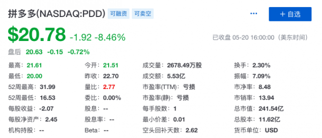 营收方面的高速增长,让拼多多股价盘前涨幅一度超过6%。但是,巨额的净亏损让拼多多在周一的美股交易中受到冲击,一度下跌11.8%。截至美股周一收盘,拼多多股价报收于20.78美元,下滑幅度为8.46%,目前总市值约241.54亿美元。