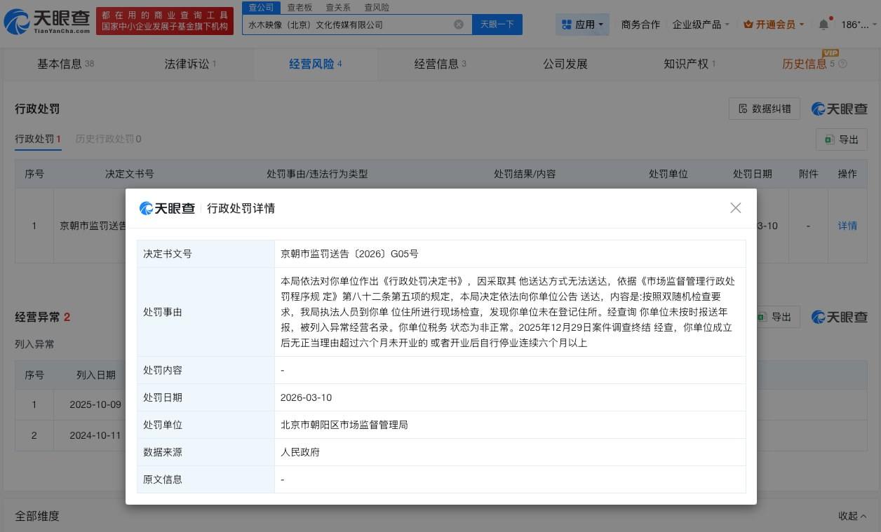 天眼查经营风险信息显示,近日,水木映像(北京)文化传媒有限公司被三间房市场监督管理所作出《行政处罚决定书》,并决定处罚吊销执照(登记证)。