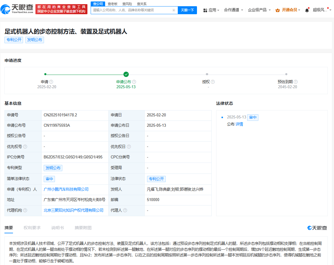 天眼查App显示,5月13日,广州小鹏汽车科技有限公司申请的“足式机器人的步态控制方法、装置及足式机器人”专利公布。