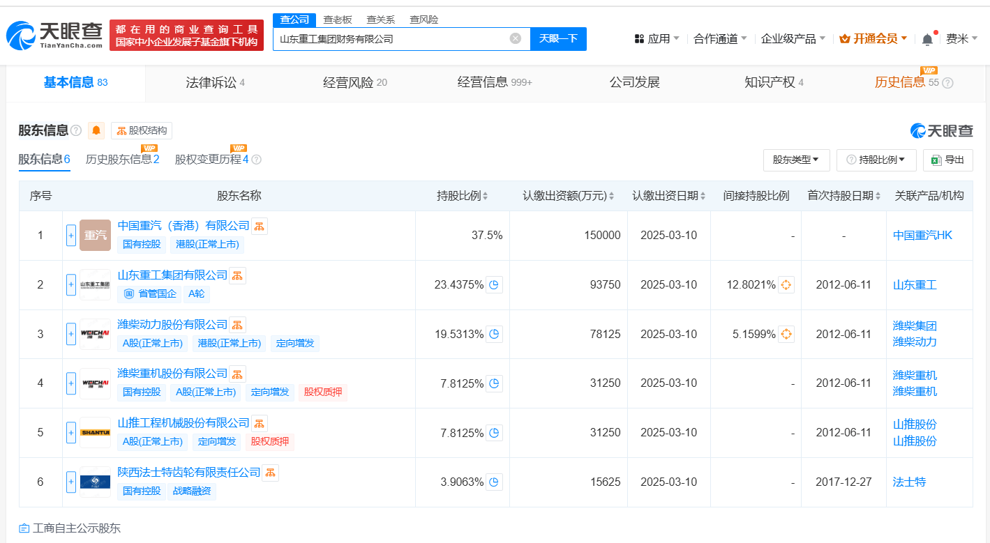 天眼查App显示,近日,山东重工集团财务有限公司发生工商变更,新增中国重汽(03808.HK)为股东,注册资本由16亿人民币增至40亿人民币,增幅150%,同时部分高管发生变更。