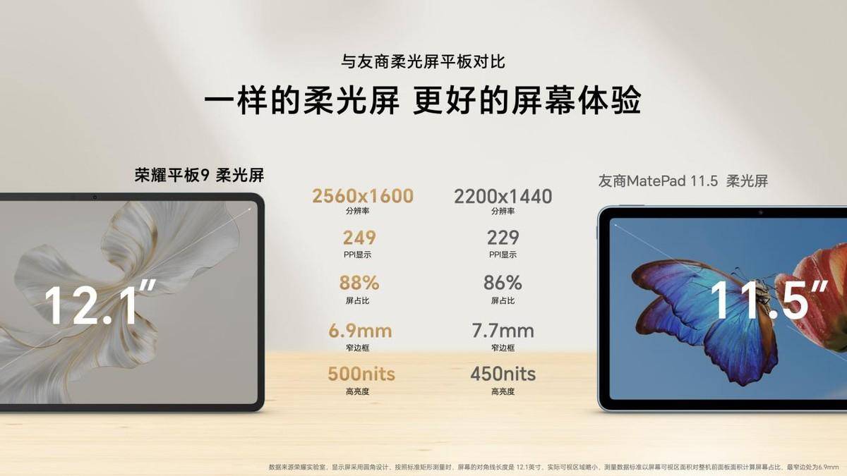 除了柔光屏技术外,荣耀平板9的这块12.1英寸大屏,还拥有高达88%的屏占比,具备旗舰级平板的屏占比水准;支持2.5K分辨率,120Hz刷新率和10.7亿色高色深显示,为用户提供顺滑流畅的视觉效果和鲜活的色彩呈现;屏幕亮度高达500nits,在强光下屏幕内容依然清晰可见。即使与友商柔光屏平板对比,荣耀平板9在分辨率,PPI显示,屏占比等五个重要维度上都大幅领先。