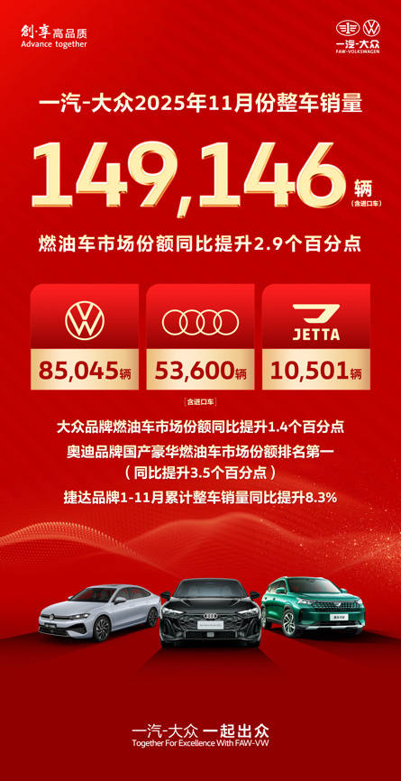 12月1日,一汽-大众发布最新销量业绩:11月实现整车销售149,146辆(含进口车),燃油车市场份额同比提升2.9个百分点。