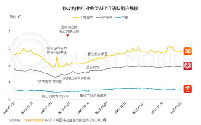 据QuestMobile发布《2020中国移动互联网春季大报告》数据显现,移动互联网月活用户数迎来较大的增长,在2019年春节触达11.38亿并且进入长达一年的稳态动摇之后,在2020年3月,胜利打破11.56亿。同时,月人均单日运用时长,从去年的5.6小时增加至7.2小时,增幅28.6%。在移动购物行业典型APP日活跃用户规模中,手机淘宝和拼多多都有较为明显的上涨曲线。