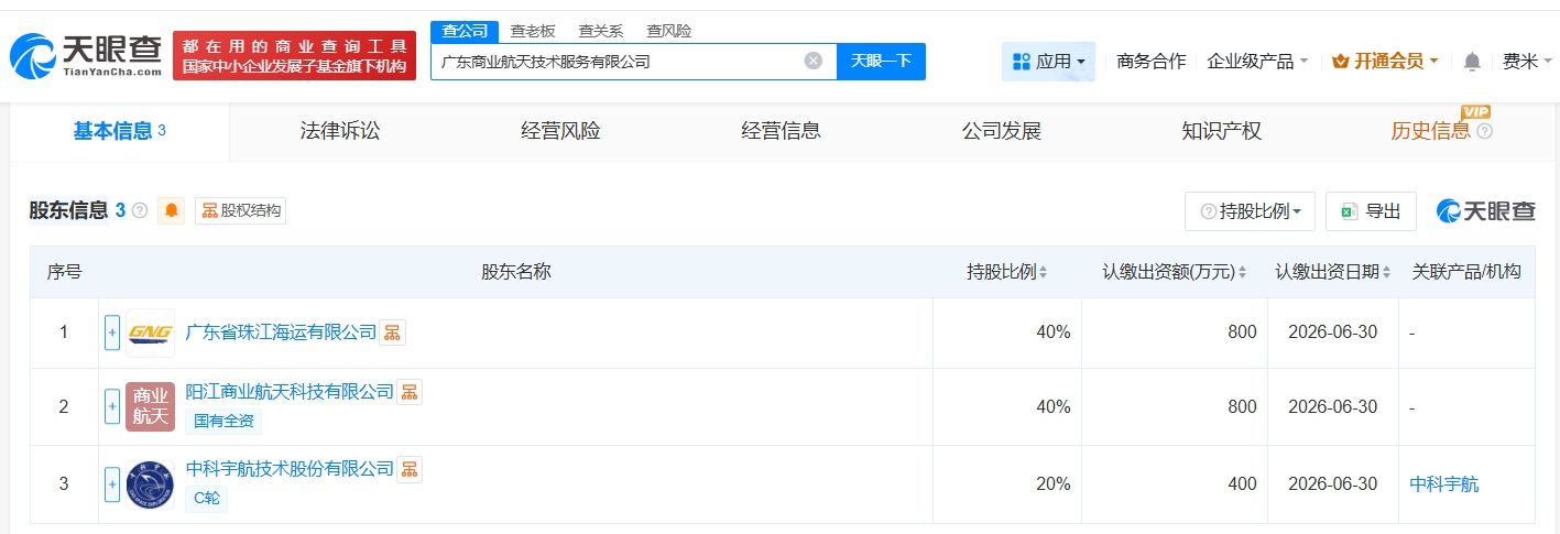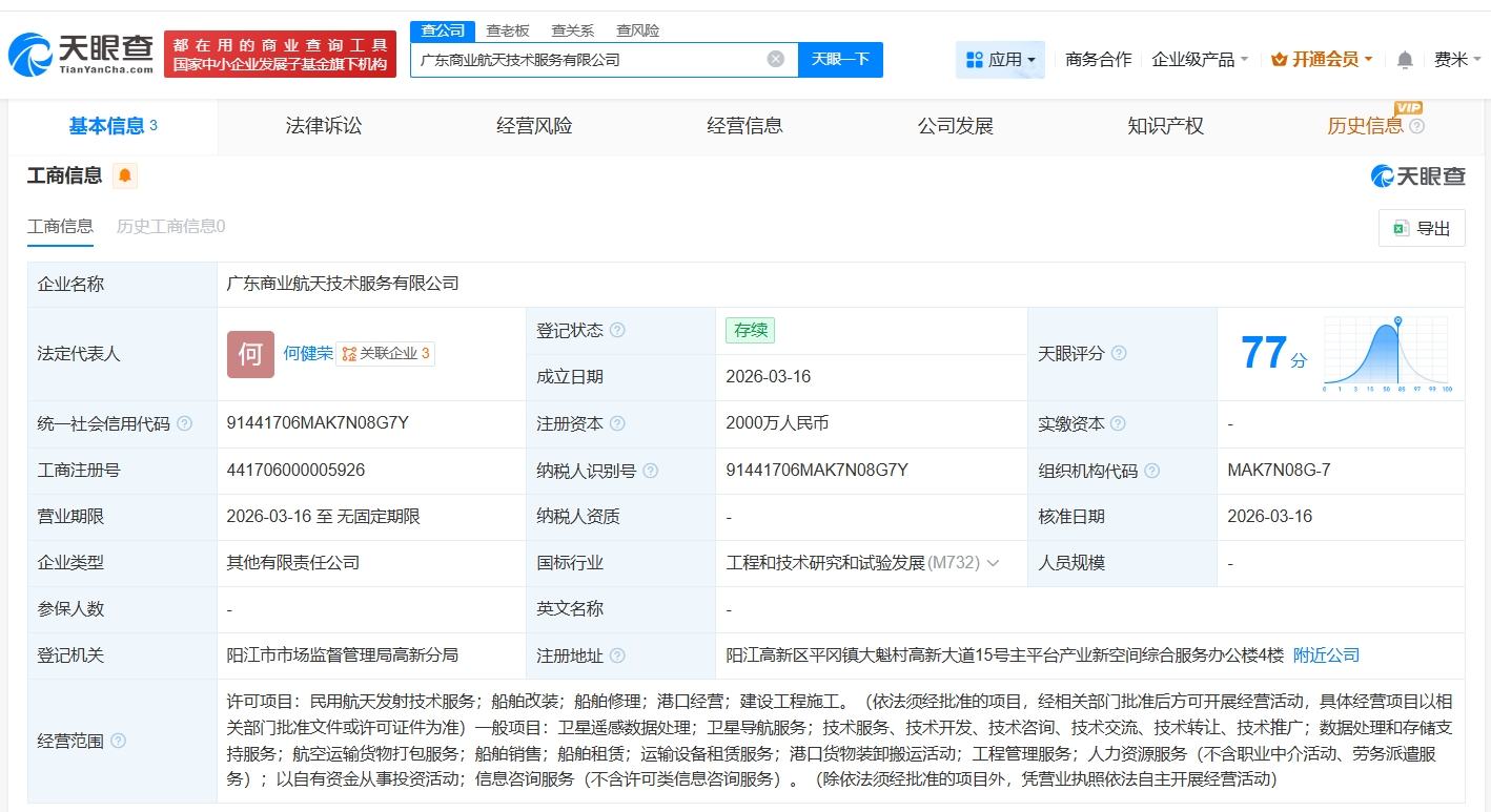 天眼查App显示,近日,广东商业航天技术服务有限公司成立,法定代表人为何健荣,注册资本2000万人民币,经营范围含民用航天发射技术服务、卫星遥感数据处理、卫星导航服务等。股东信息显示,该公司由广东省珠江海运有限公司、阳江商业航天科技有限公司、中科宇航技术股份有限公司共同持股。
