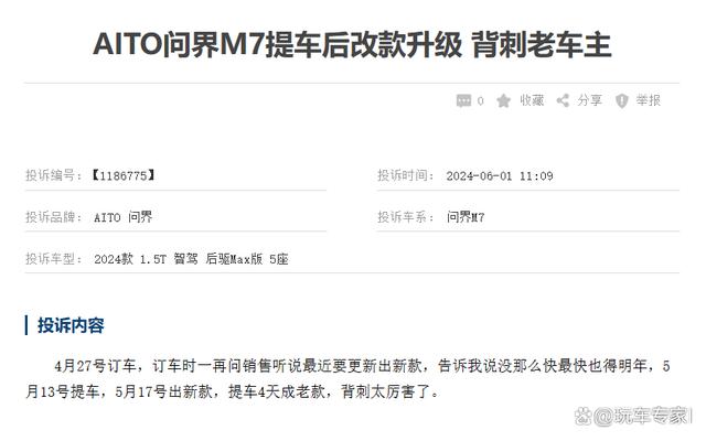 6月刚刚过去3天时间,投诉网站上就出现大量投诉,问界M7改款升级,背刺老车主的投诉,有用户投诉:4月27日订车,订车期间一再问销售最近有要更新出新款,销售告知用户没那么快,最快也得明年,结果5月13号提车,5月17号出新款,提车4天成老款,背刺太厉害了。