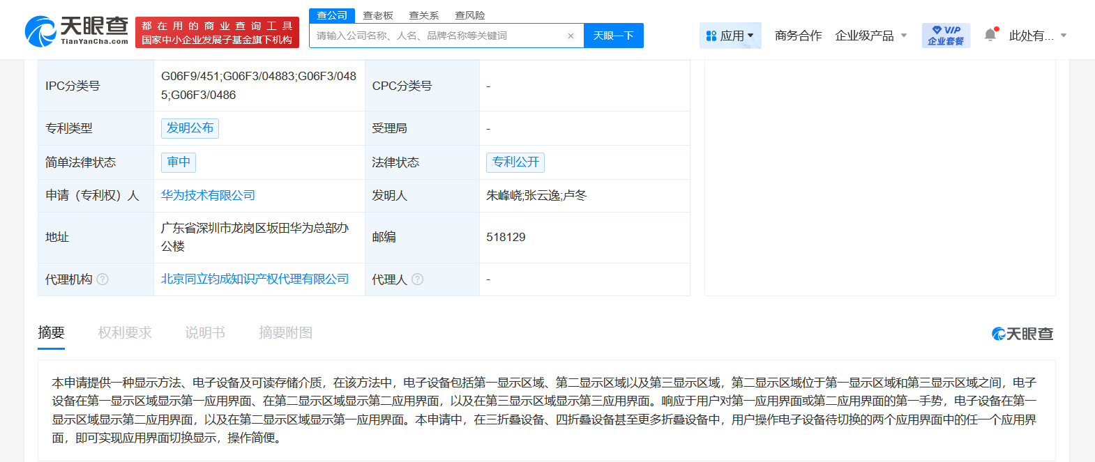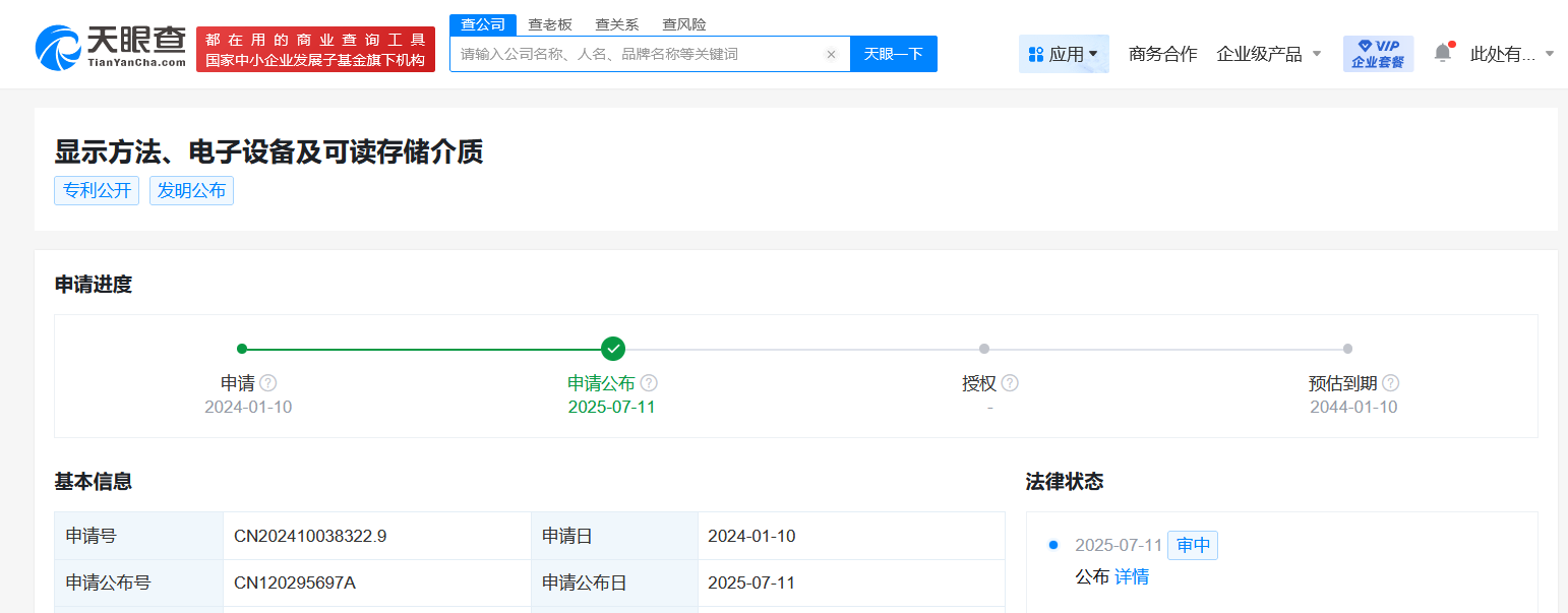 天眼查财产线索信息显示,近日,华为技术有限公司申请的“显示方法、电子设备及可读存储介质”专利公布。