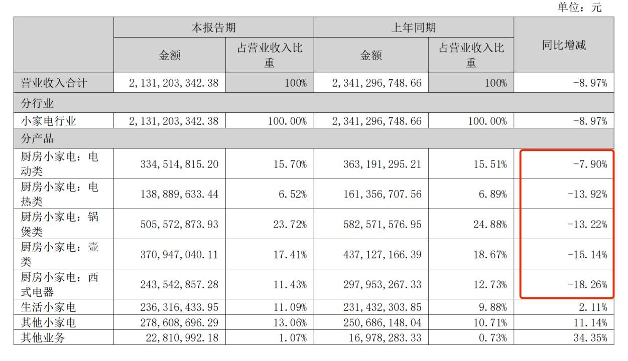 据半年报,今年上半年,小熊电器厨房小家电中的五类产品营收均出现同比下滑。其中同比降幅最大的为包括空气炸锅在内的西式电器,营收近2.44亿元,同比下滑18.26%。