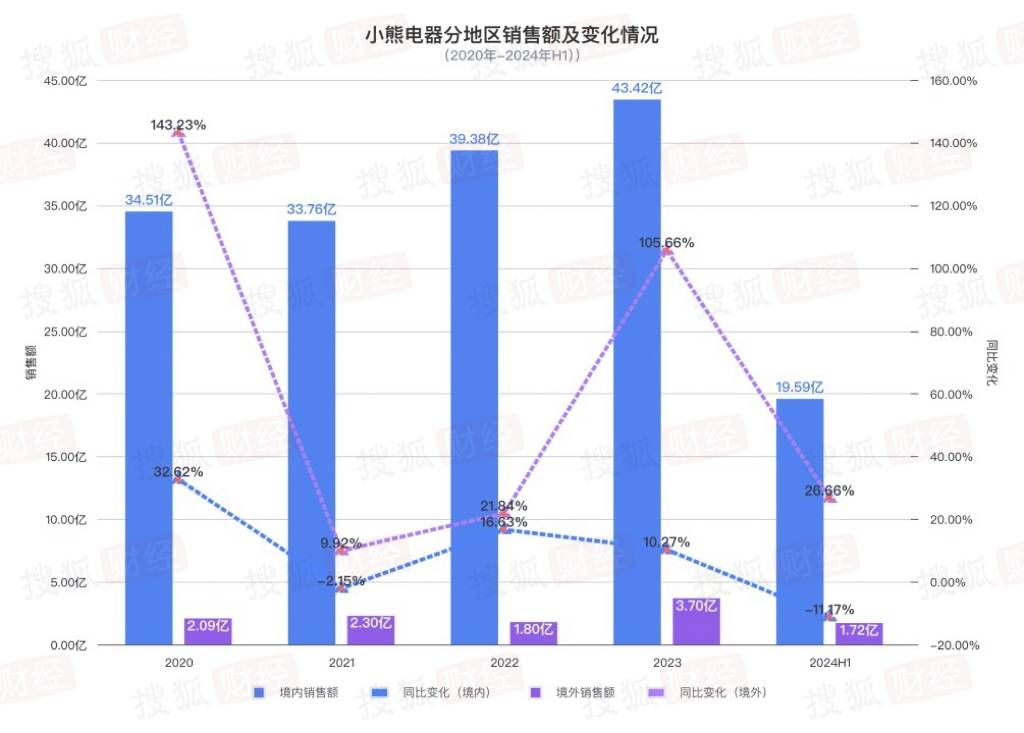分地区来看,2024年上半年,小熊电器的海外销售额达到了1.72亿元,同比增长26.66%。而国内销售额为19.59亿元,同比下降11.17%。