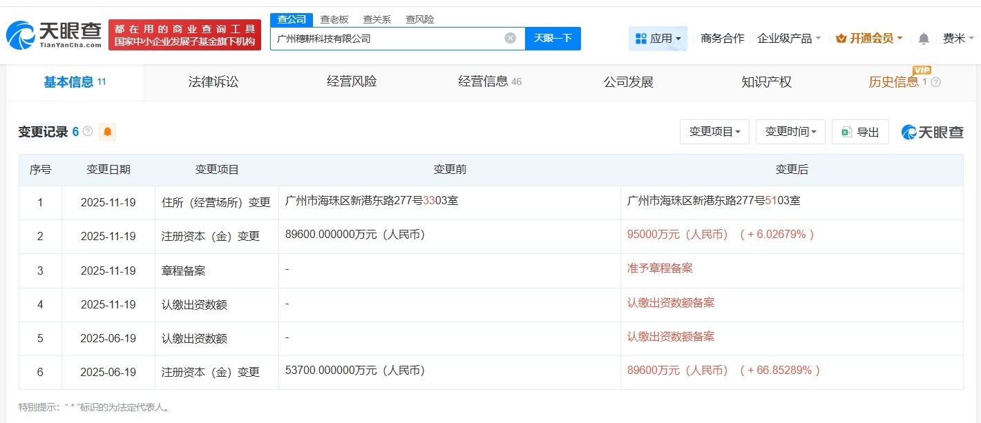 天眼查工商信息显示,近日,广州穗耕科技有限公司发生工商变更,注册资本由8.96亿人民币增至9.5亿人民币,增幅约6%。