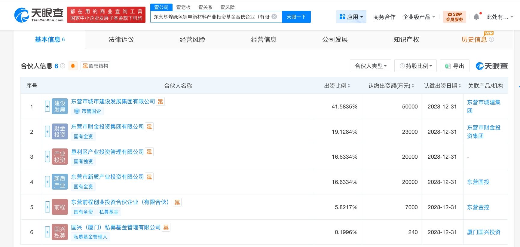 天眼查工商信息显示,近日,东营辉煌绿色锂电新材料产业投资基金合伙企业(有限合伙)成立,执行事务合伙人为国兴(厦门)私募基金管理有限公司,出资额约12亿人民币,经营范围为以私募基金从事股权投资、投资管理、资产管理等活动。合伙人信息显示,该基金由东营市城市建设发展集团有限公司、东营市财金投资集团有限公司、垦利区产业投资管理有限公司等共同出资。