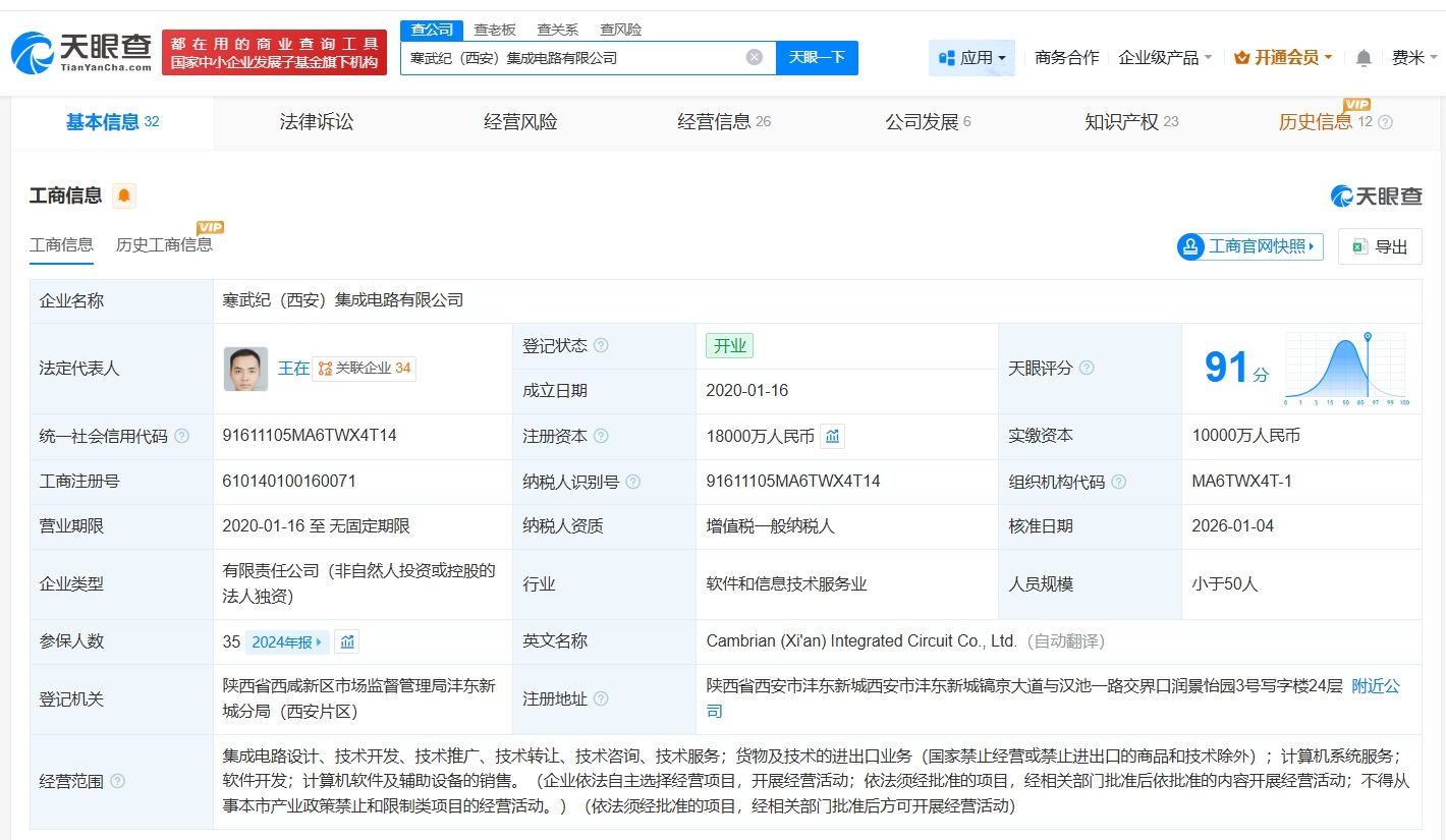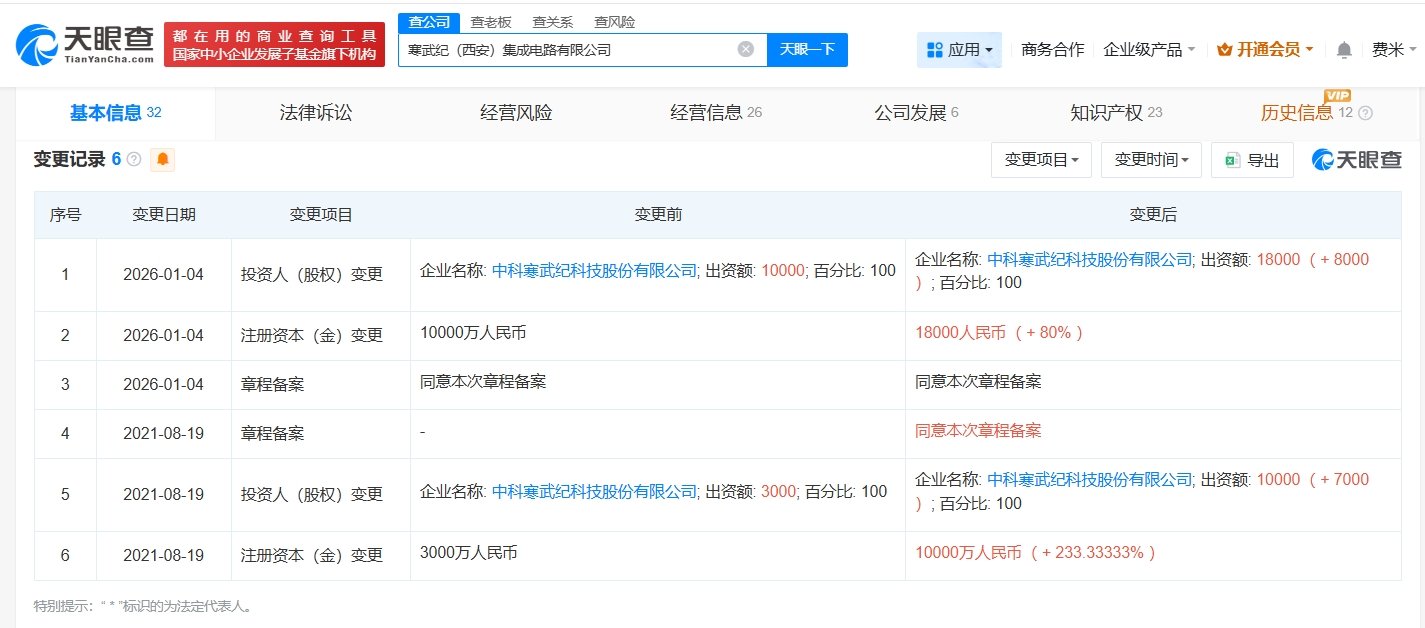 天眼查工商信息显示,近日,寒武纪(西安)集成电路有限公司发生工商变更,注册资本由1亿人民币增至1.8亿人民币,增幅80%。