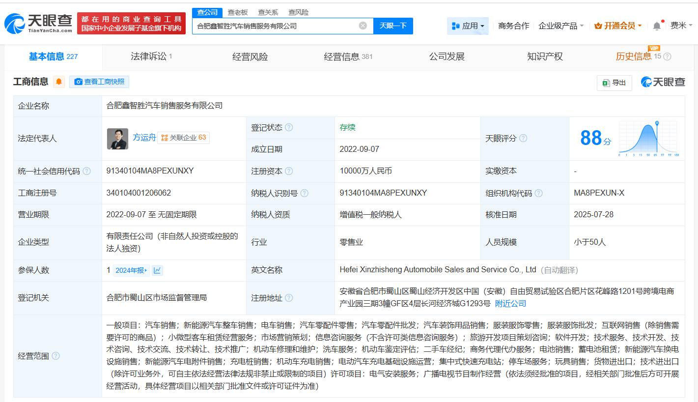 天眼查App显示,近日,合肥鑫智胜汽车销售服务有限公司发生工商变更,刘磊卸任法定代表人、董事、经理,方运舟接任法定代表人、董事并担任财务负责人,同时部分主要人员发生变更。该公司成立于2022年9月,注册资本1亿人民币,经营范围包括汽车销售、新能源汽车整车销售、电车销售等。股东信息显示,该公司由哪吒汽车旗下众联天下汽车销售服务有限公司全资持股。
