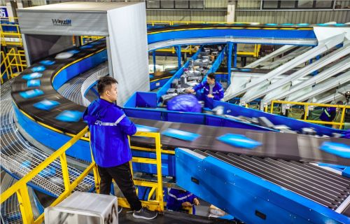 中通快递上海转运中心全速运转的双层自动分拣设备