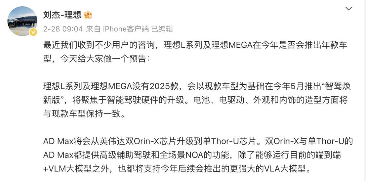 今年2月28日,理想汽车副总裁刘杰在微博发文表示,“理想L系列及理想MEGA没有2025款,会以现款车型为基础在今年5月推出“智驾焕新版”,将聚焦于智能驾驶硬件的升级。电池、电驱动、外观和内饰的造型方面将与现款车型保持一致。”
