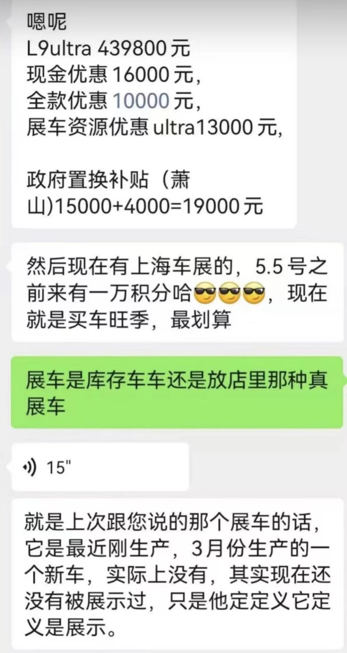 另一位车主表示“3月31日买的L9顶配,4月1日就搞展车的套路便宜1W+,背刺消费者,要不是我介绍朋友过来买,销售透底过来,我们都蒙在鼓里。”