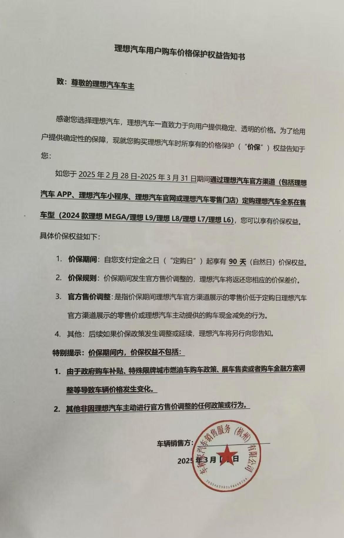 一位车主展示的一份理想汽车保价协议告知书显示,“理想汽车一直致力于向用户提供稳定、透明的价格。为了给用户提供确定性的保障”,对2025年2月28日-2025年3月31日期间通过官方渠道定购理想汽车全系在售车型进行价保。