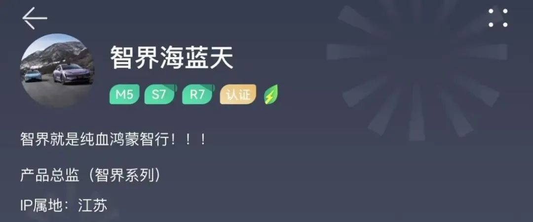 除上述两次引发外界热议的事件外,海蓝天在其主页上的简介也受到网友广泛关注。其在签名栏处写道,“智界就是纯血鸿蒙智行”,附以三个感叹号。